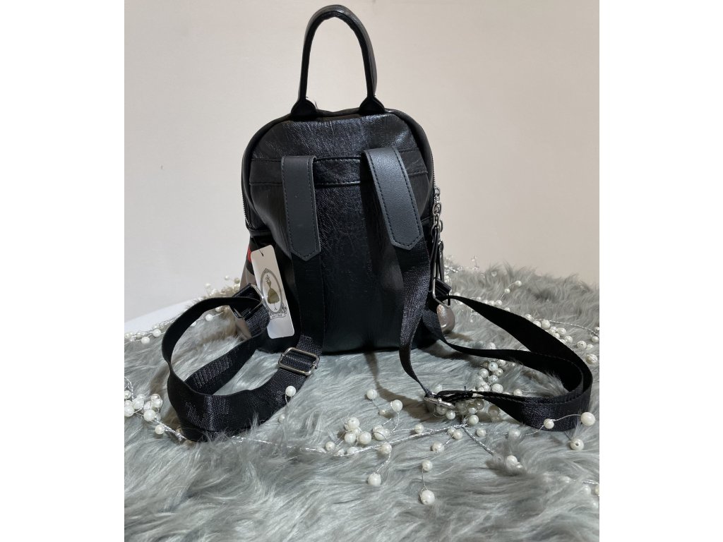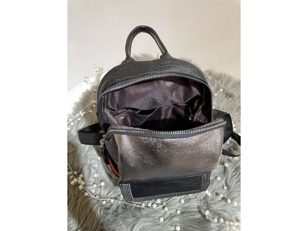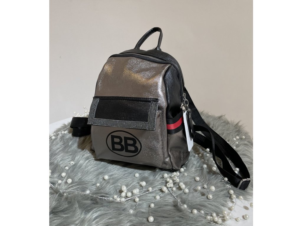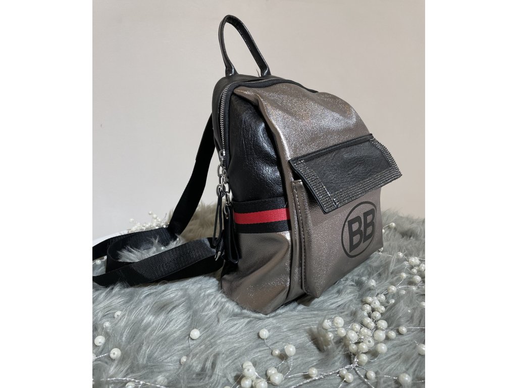 Stylový batoh v elegantním designu, vyrobený z kombinace černé a lesklé šedé syntetické kůže. Batoh má přední kapsu s černým suchým zipem a logem "BB". Na bocích batohu jsou červené a černé pruhy, které dodávají moderní vzhled. Batoh je vybaven černými popruhy a kovovými detaily, které zajišťují pevnost a odolnost. Ideální doplněk pro každodenní nošení i speciální příležitosti.